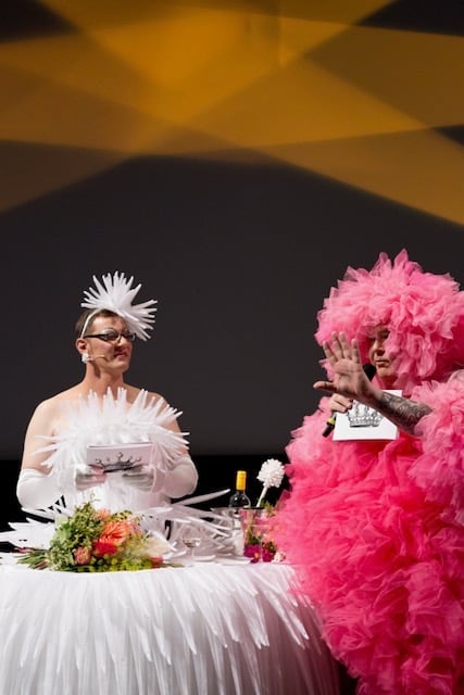 Hier versammelt sich das performative Kernwerk der 1990er und frühen 2000er: Drag-Shows, Bühnennummern, satirische Abendformate und titelstarke Gesamtkunstwerke zwischen Camp, Punk, Pop und politischer Körperpoetik. Von den frühen Hafenstraßen-nahen Arbeiten bis zu großen Showabenden (und dem legendären Langzeitformat „25 Stunden nonstop“) zieht sich eine Linie: scharfe Komik, groteske Bildwelten, performative Zuspitzung – und immer eine Lust am kollektiven Ausnahmezustand.