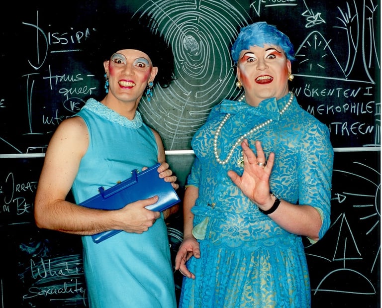 Hier liegt die aktivistische und community-organisierende Linie: Tunten-Spaziergänge, Protestformen, Gründungen, Kongresse, Demos, Workshops, satirische Interventionen und öffentliche Aktionen – stark verankert in frühen 1990er Kämpfen (Hafenstraße, internationale Vernetzung, Clause 25/28) und mit einem deutlichen Schwerpunkt auf queerfeministischer Selbstermächtigung durch Sichtbarkeit, Humor, Unverschämtheit und Strukturaufbau. Dieser Bereich zeigt: Performance war füruns nie nur Bühne, sondern auch Werkzeug – gegen Abrissbirne, gegen Repression, gegen Angst, für Gemeinschaft. Und immer mit Blessless Mahoney.